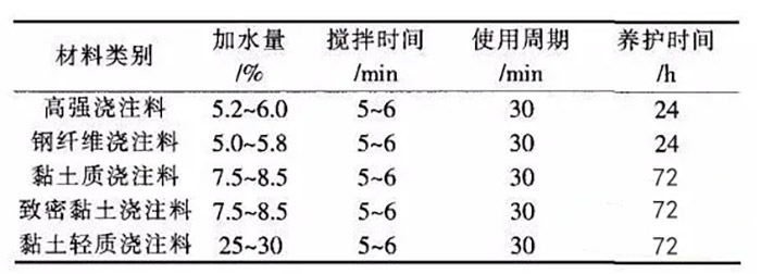 (7)攪拌好的澆注料不得二次加水使用,并應(yīng)在30min內(nèi)用完,剩余的混凝土(澆注料)須丟棄。澆注料養(yǎng)護(hù)按照表1執(zhí)行,驗(yàn)收合格后方可拆模。