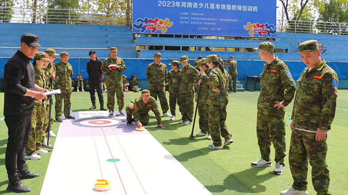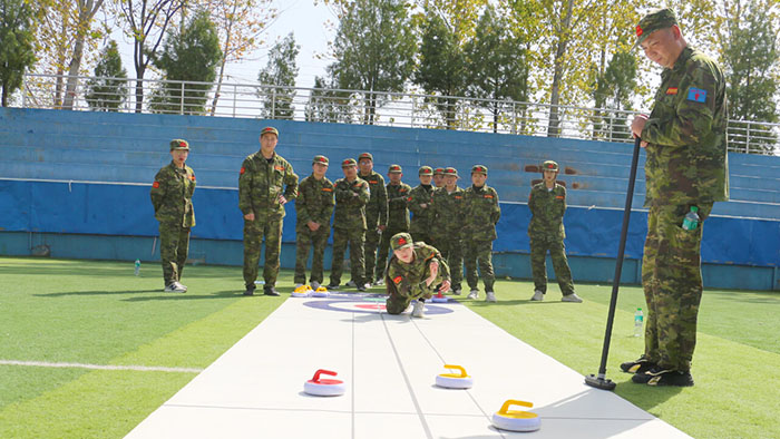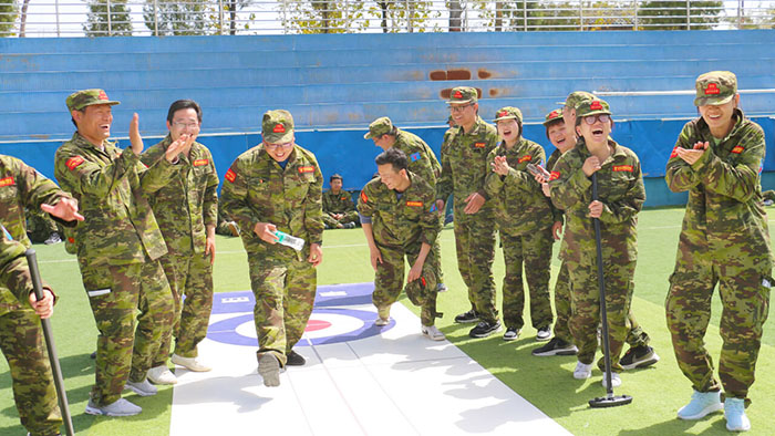 在【旱地冰壺】項(xiàng)目中,八個(gè)小組的隊(duì)員們一邊商榷對(duì)敵戰(zhàn)術(shù),一邊進(jìn)行任務(wù)分配。隨著一聲哨響,兩個(gè)賽隊(duì)同時(shí)開(kāi)賽。隊(duì)員們?nèi)褙炞ⅰ⒛耢o氣,向前邁步?jīng)_刺,揮動(dòng)手臂擲壺,冰壺按照隊(duì)員們?cè)O(shè)想的路線擊打到對(duì)方的冰壺,使其滑出得分圈并穩(wěn)穩(wěn)地停留在中心點(diǎn),成功得分,大家歡呼雀躍,圍觀隊(duì)員們也紛紛叫好,掌聲、歡呼聲此起彼伏,好不熱鬧。