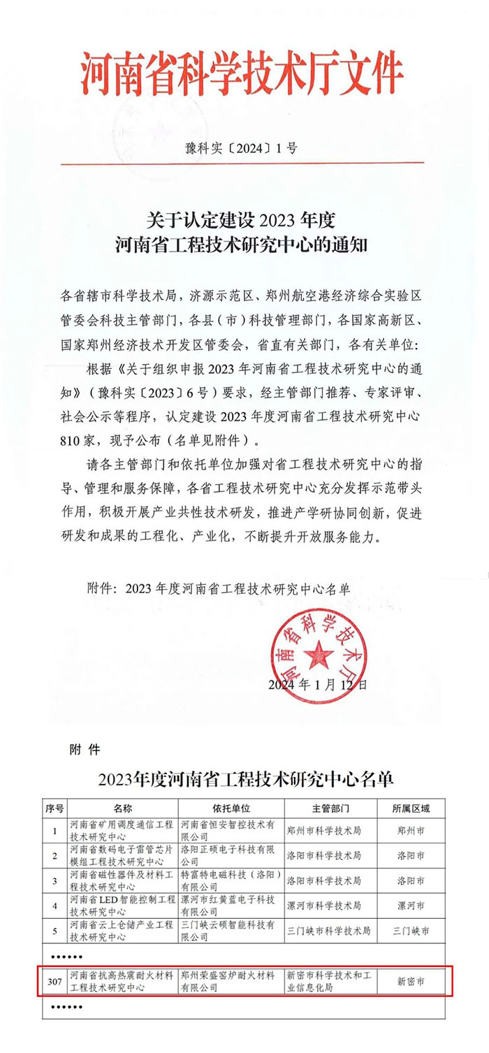 近日,河南省科學(xué)技術(shù)廳發(fā)布了《關(guān)于認(rèn)定建設(shè)2023年度河南省工程技術(shù)研究中心的通知》。經(jīng)申報、主管部門推薦、專家論證和研究等程序,鄭州榮盛窯爐耐火材料有限公司(以下簡稱“榮盛耐材”)申報的“河南省抗高熱震耐火材料工程技術(shù)研究中心”正式獲批。